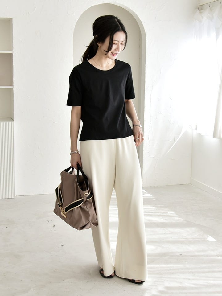 サイズ感:着丈はヒール合わせで床すれすれくらいの長さ。落ち感のある生地ですっきりとしたシルエットで履けます。