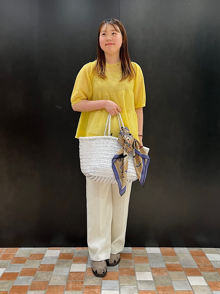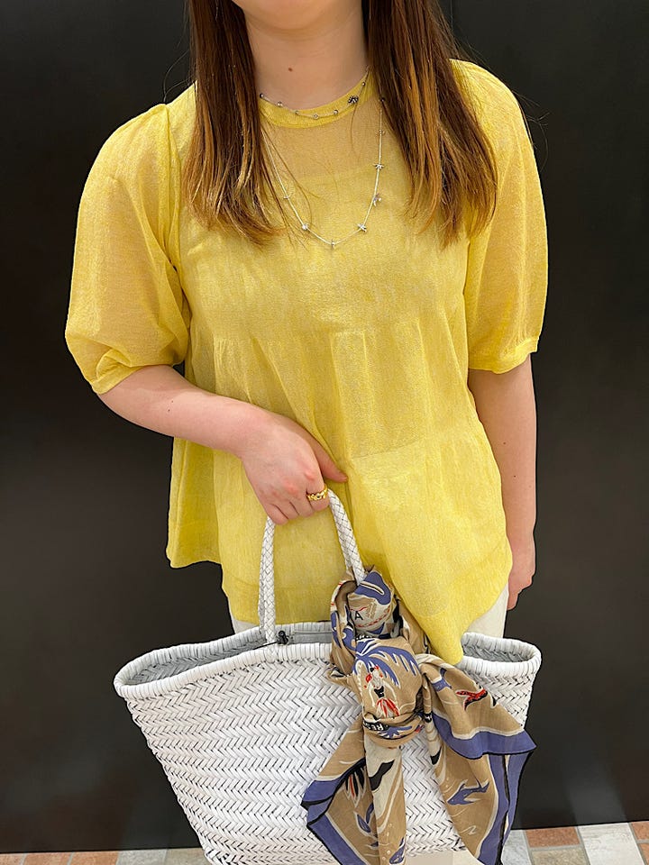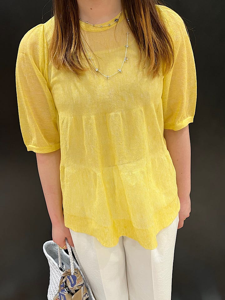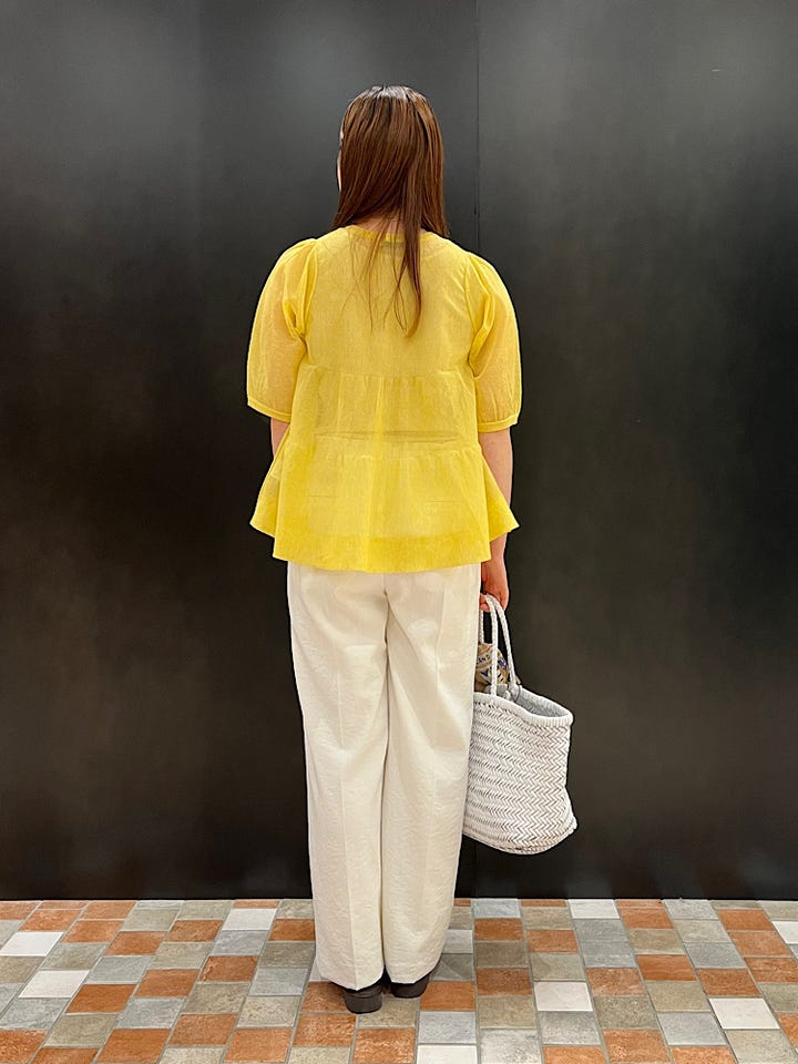麻とポリエステル素材なので、肌離れが良く軽い着心地です◎透け感もあり、黄色のビタミンカラーが夏に映えそうです!ネイビーや白だと、中のインナー次第で、秋頃まで着用できます。ティアードになっていて横から見たときのふんわり感がとても可愛いです^_^