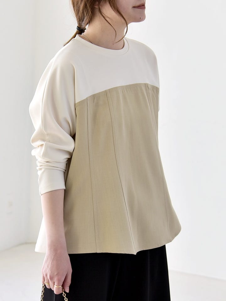 異素材の切り替えトップスが主役の、やわらかく上品な大人カジュアルスタイル。