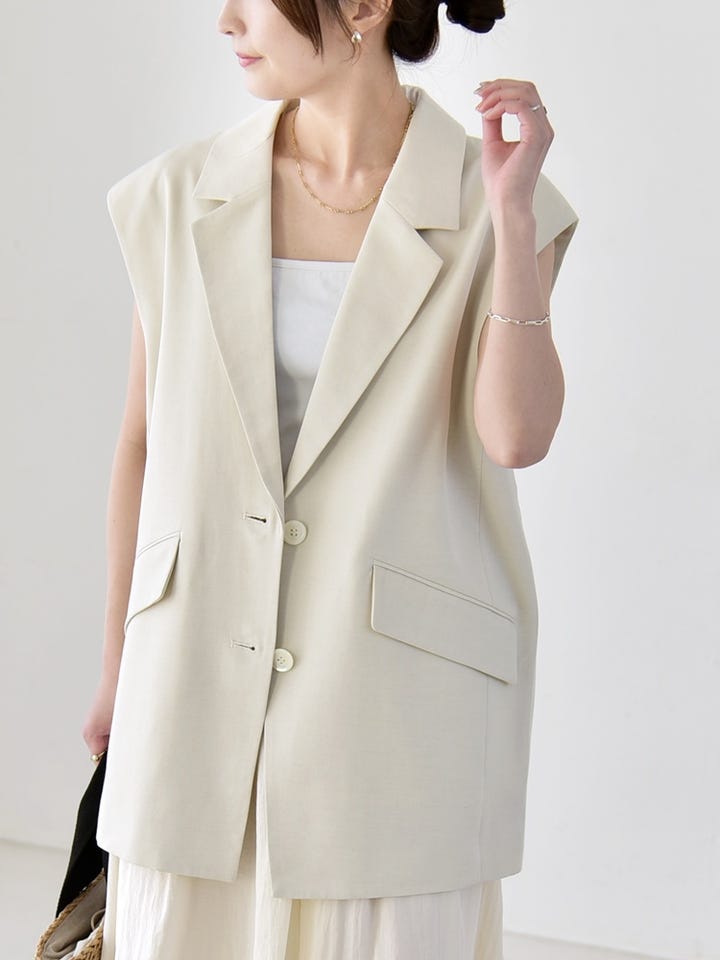 ゆったりとしたジレの縦ラインで、すっきりとしたシルエットに。