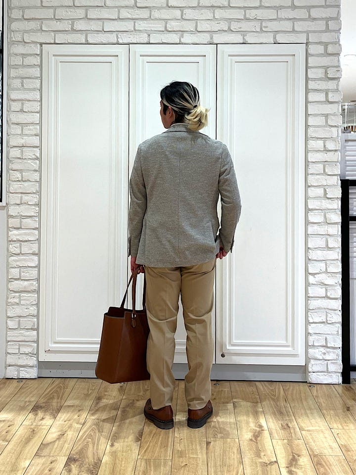 着心地:ストレッチが効きかつテーパードシルエットなので見た目以上に楽に着ることができます。