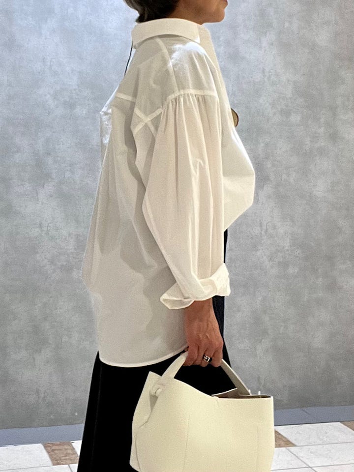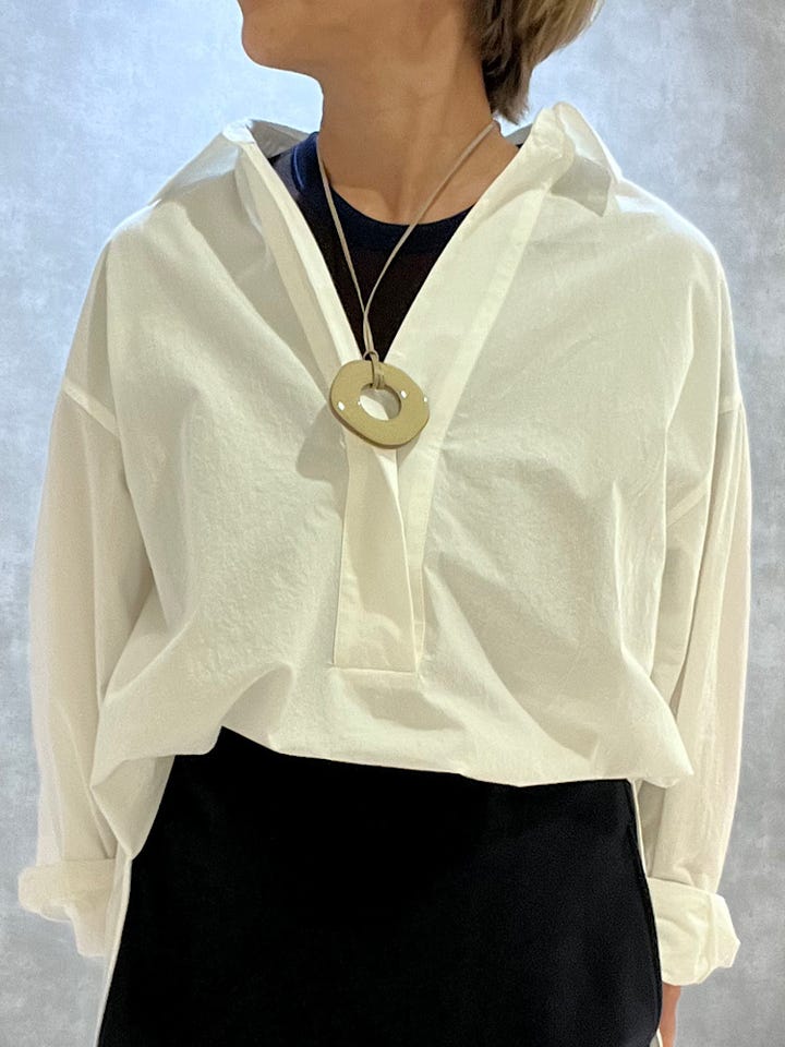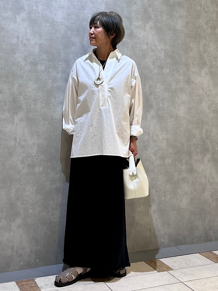着用感 : コットン生地のスキッパーシャツで襟もスッキリしています。着丈が短くないのでボトムスにインして雰囲気変えてみては如何でしょうか?