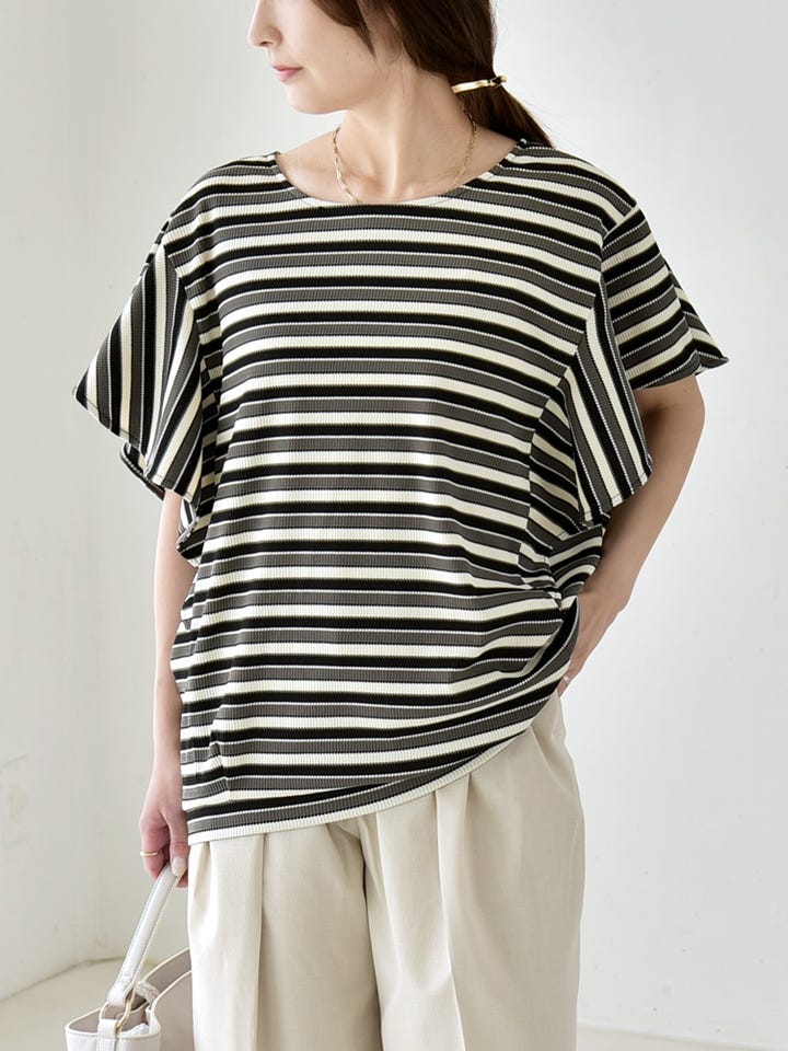 サイズ感:着丈はヒップにかかる長さ。身幅は余裕がありゆったり着られます。袖は二の腕中間くらいのラッフルスリーブで腕がすっきり見えます。