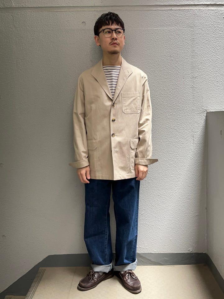 着心地:ラペル部分が特徴のあるジャケットです。ハンティング由来のジャケットで、程よく抜け感のあるアイテムです。