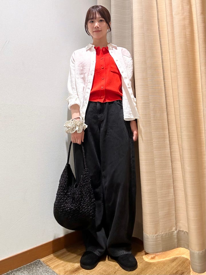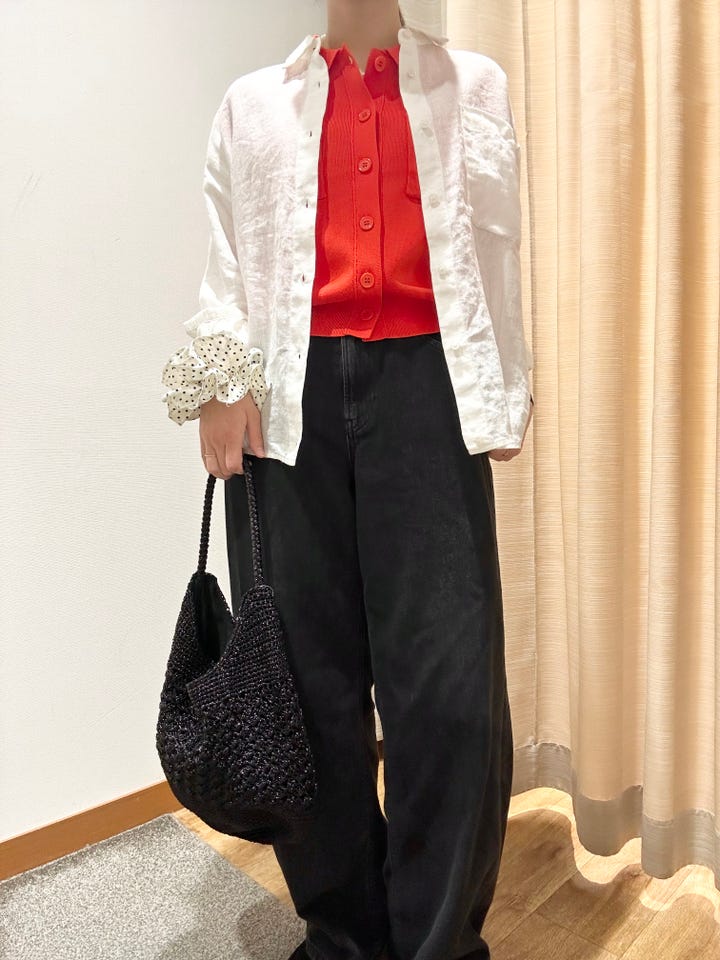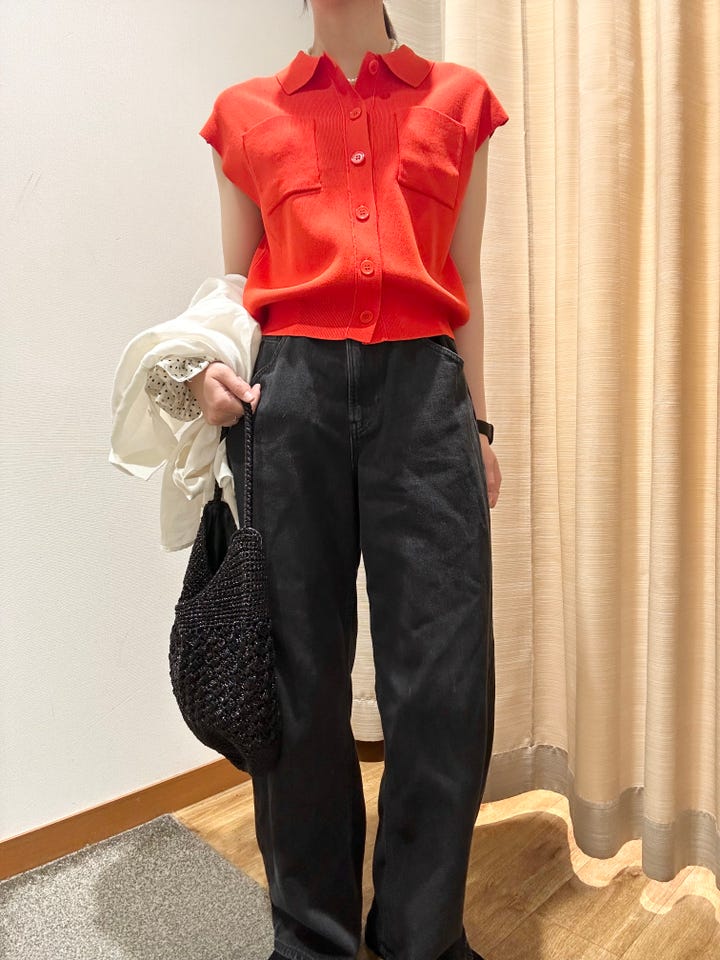 着心地:ニット素材ですが若干のシャリ感があるので夏でも暑くならずに着ていただけます。パキッとしたオレンジがかわいいです◎