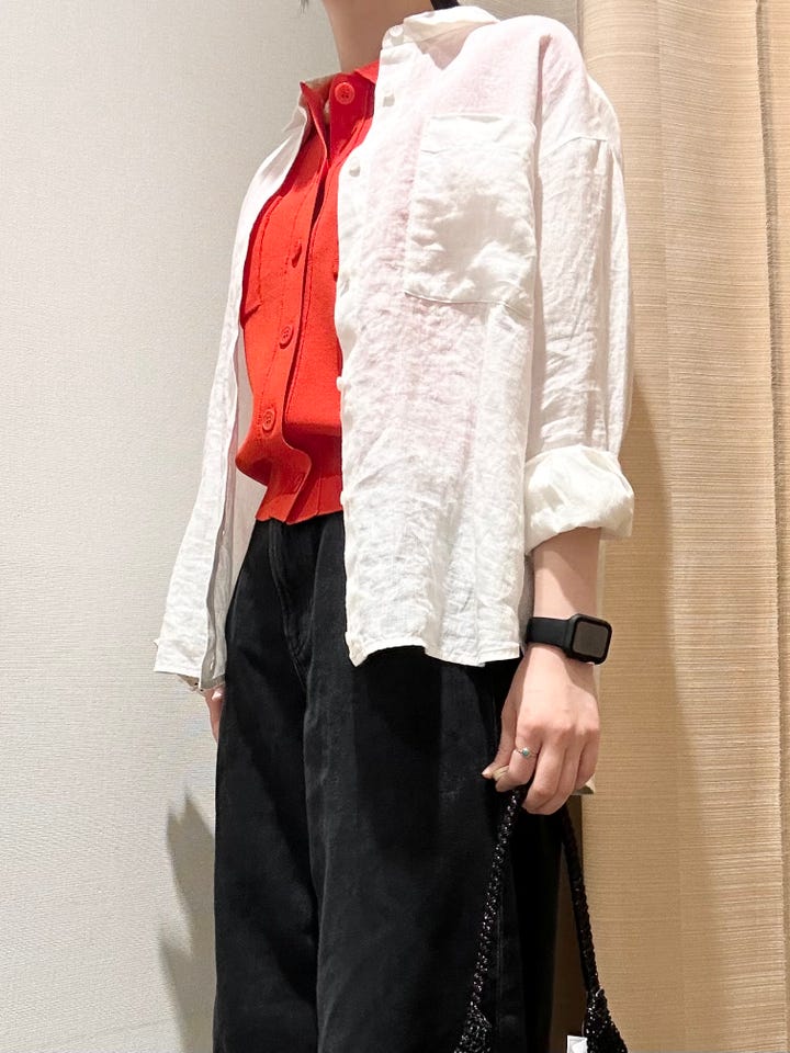 着心地:リネン100%のシャツです。夏でもさらっと羽織っていただける軽さがあります!