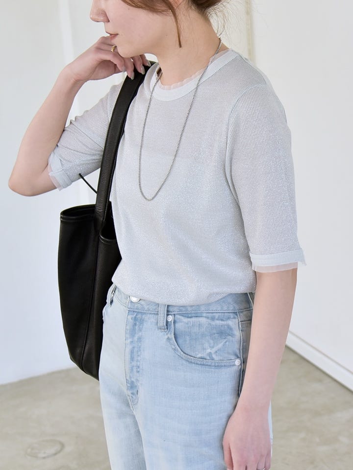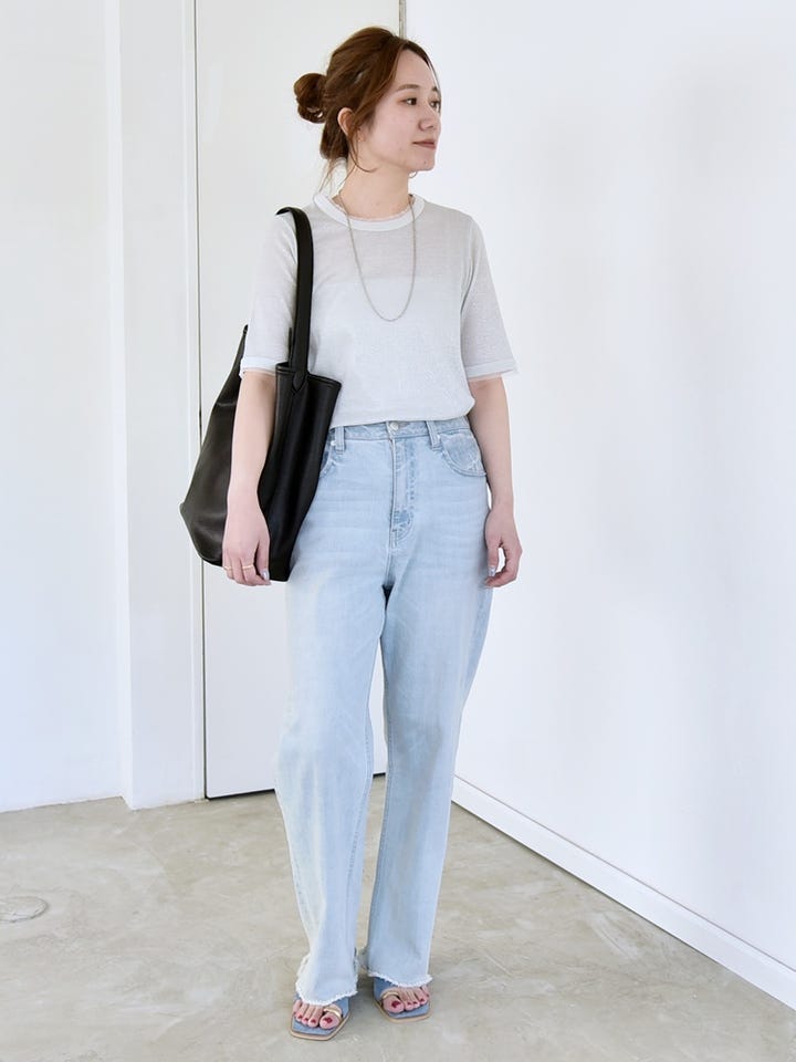 シンプルなニットTシャツ×デニムで、爽やかな大人カジュアルスタイル。