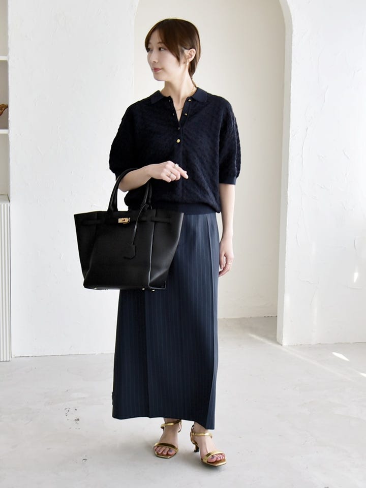 ネイビーでまとめた落ち着きのあるきれいめスタイル。