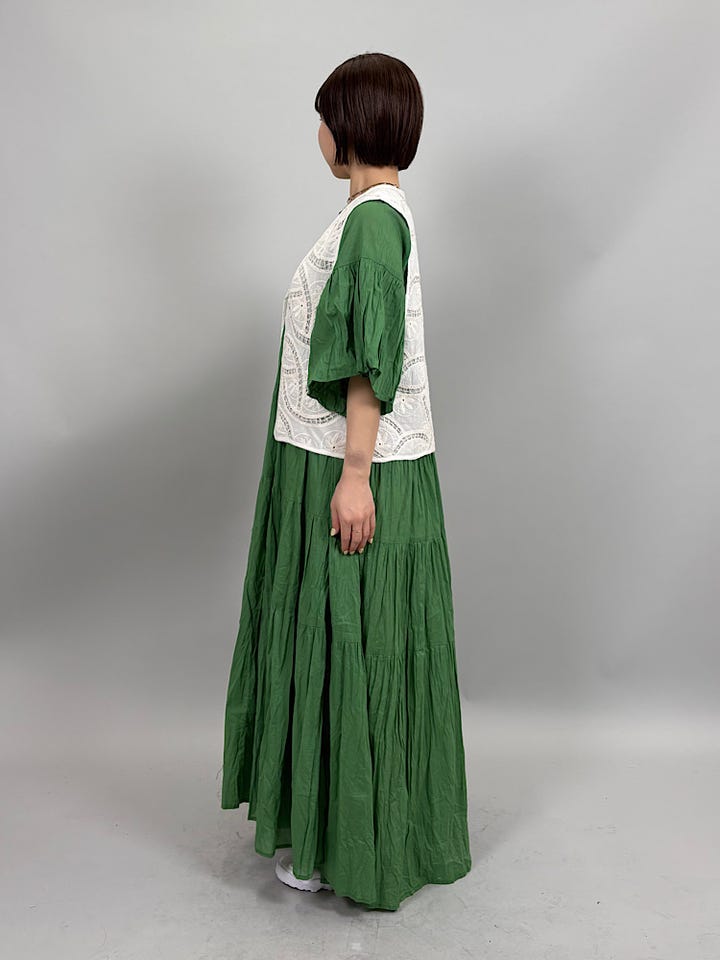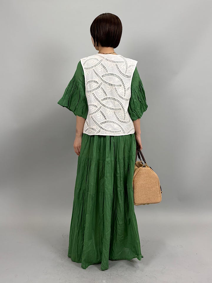 袖は5分袖で肌の露出が多すぎずギャザーもたっぷりありますが、首元はキーネックなのですっきりと着ていただけます。グリーンはSHIPS別注カラーです。