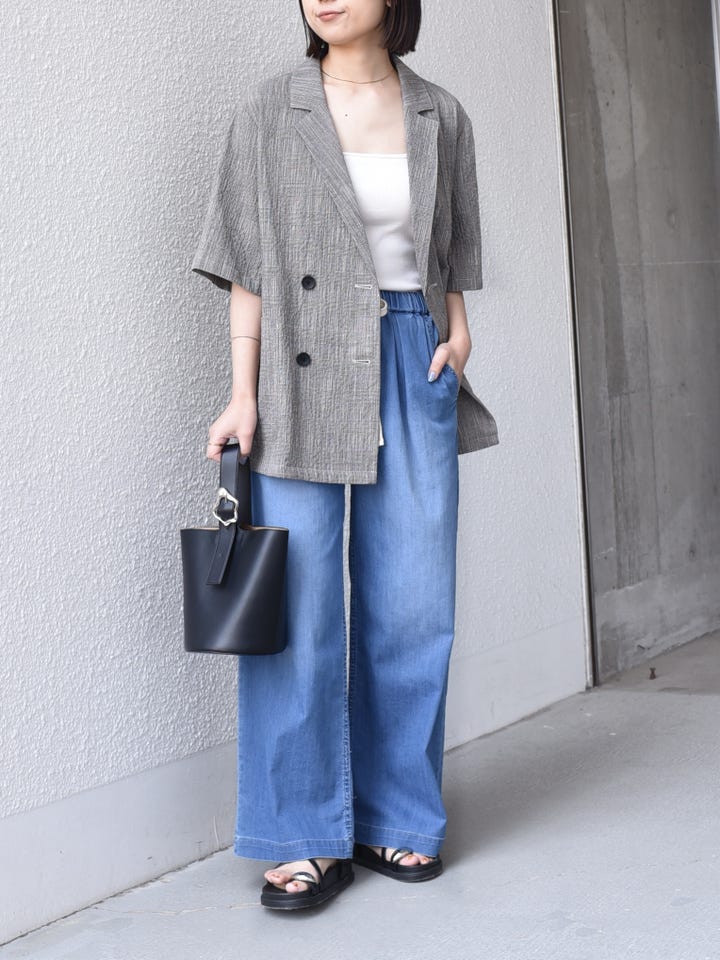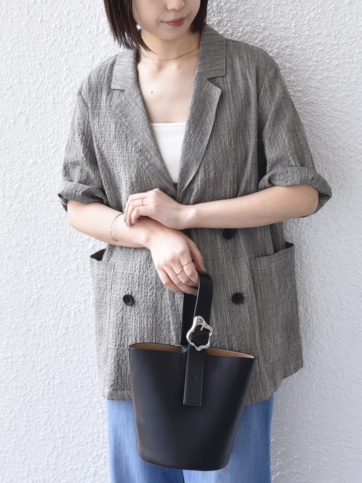 着用レビュー:涼しげな雰囲気で、夏にぴったりのジャケットです。肘が隠れるくらいの袖丈で、腕周りをカバーできるのが嬉しいポイント◎オーバーサイズなので、気軽にさらっと羽織ったいただけます!