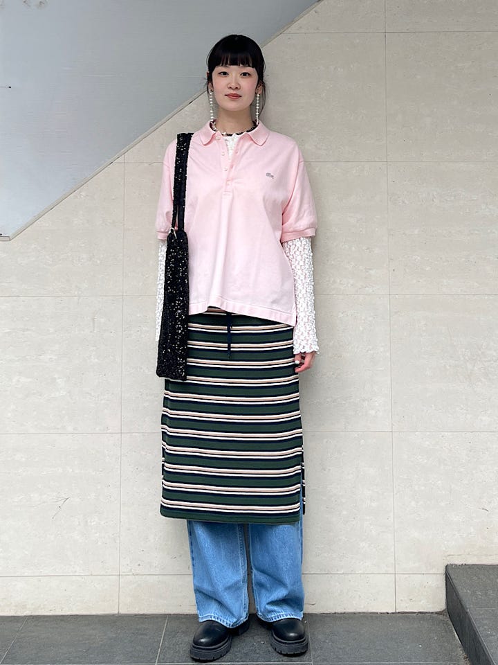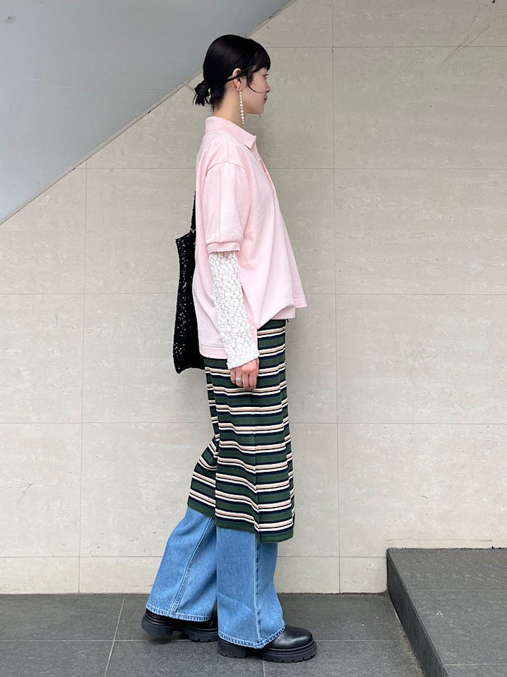 着心地:デニムと重ねても伸縮性があるので歩きやすいです。スリットが両サイドにあるので重たくならずに、アクセントとして活用できます。