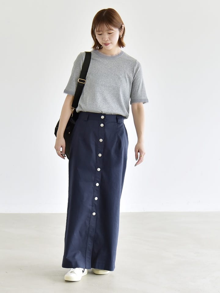 シンプルなTシャツにフボタンのロングスカートを合わせた、デイリーに使いやすいコーディネート。
