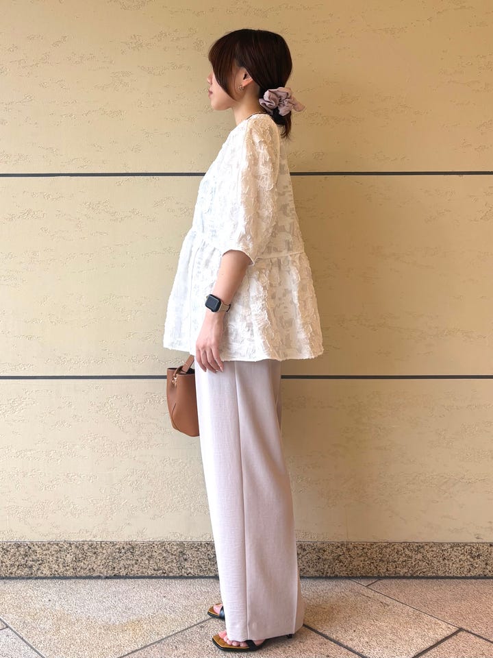 大きすぎず程よいストレートなシルエットで、上品に見えます。ウエスト後ろがゴムになっており、楽に履いていただけます。