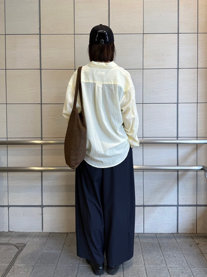 サイズ感・着心地:ゆとりあり。メンズアイテムのSサイズですが162cmの私でこの丈感です。袖はほんの少し長いくらいですが萌え袖で着てもよし、まくっても折り返してもよしなので問題なく着用できます。コットン100%の柔らかい素材感で透け感ありです。
