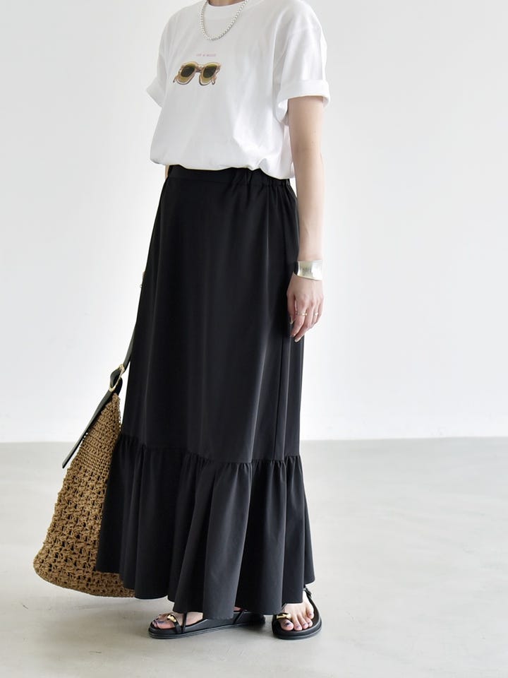 ロゴTを主役に、ブラックスカートで引き締めた大人カジュアルコーデ。