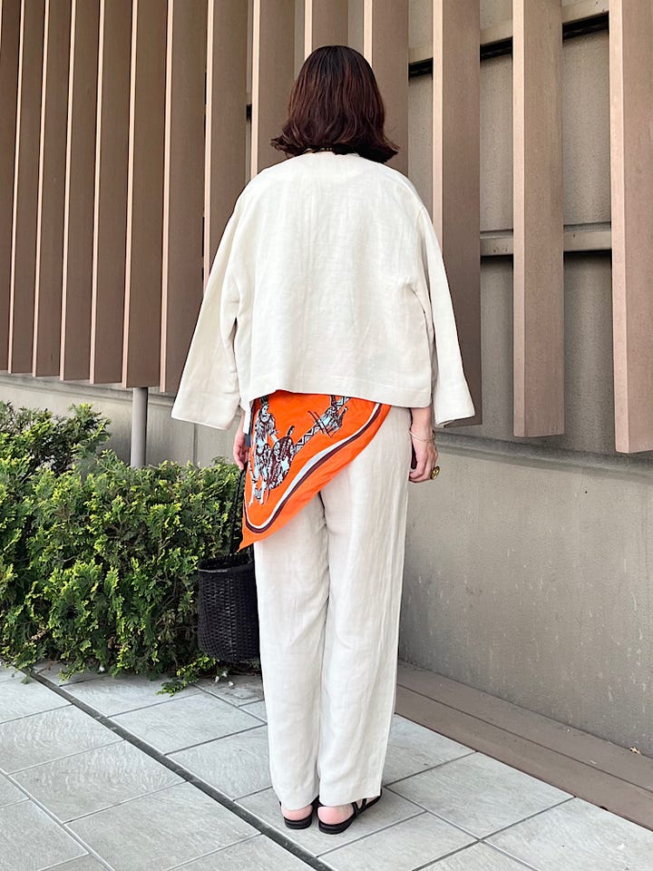 着心地: ジャケットと同素材で涼しい。ウエストもゴムで、ストレスフリーで着られる