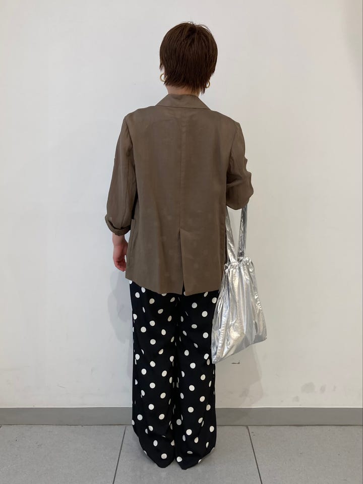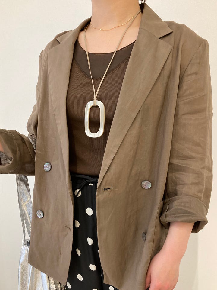 着心地:シアー素材の軽いジャケットです。ラミーで風通し良く、ダークカラーのバリーションで秋口まで長く着られます。36はコンパクトなサイズ感なのできちんと感が出やすく、通勤着にもおすすめです。
