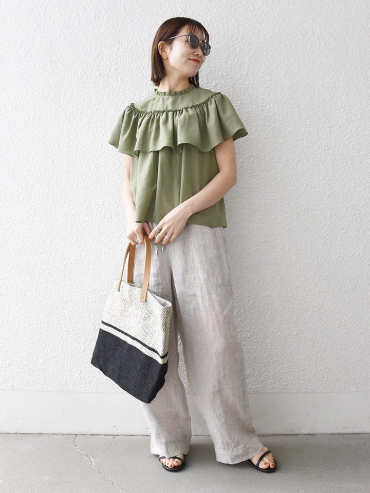 リネンパンツを合わせてカジュアルな着こなしにしました。