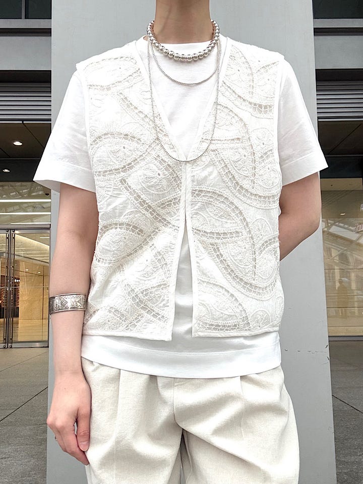 着心地: アームも大きめなので、デザインカットソーやTシャツ、ワンピースなどと合わせてご着用頂けます。総刺繍をあしらったコットンベストで軽く、薄手になってくるこれからの季節に?αでお洒落に見映えする1着です!