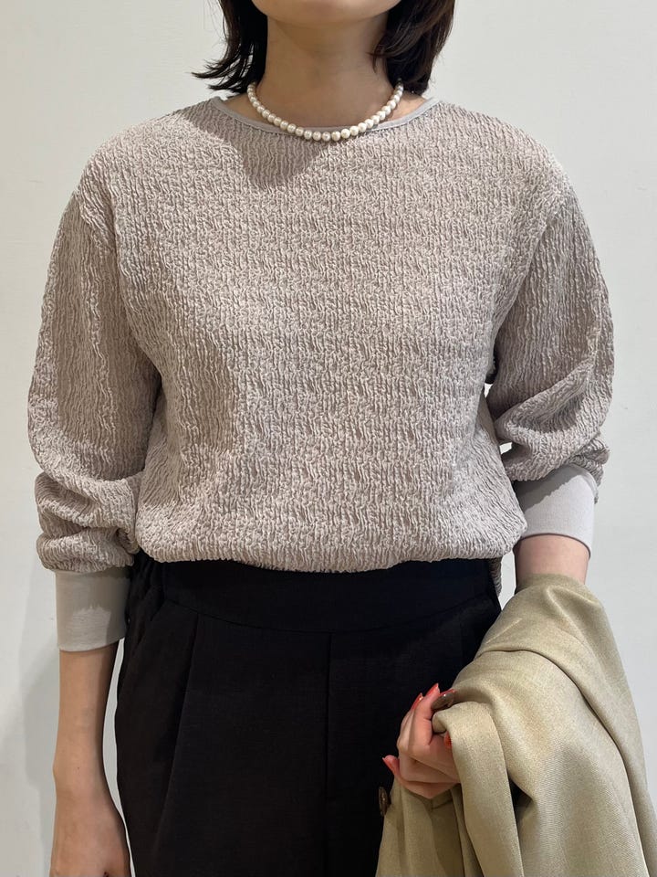 着心地:カジュアルでもきれいめでも着回しできる、トップス。立体的なデザインなので、一枚でもおしゃれな着こなしになります。