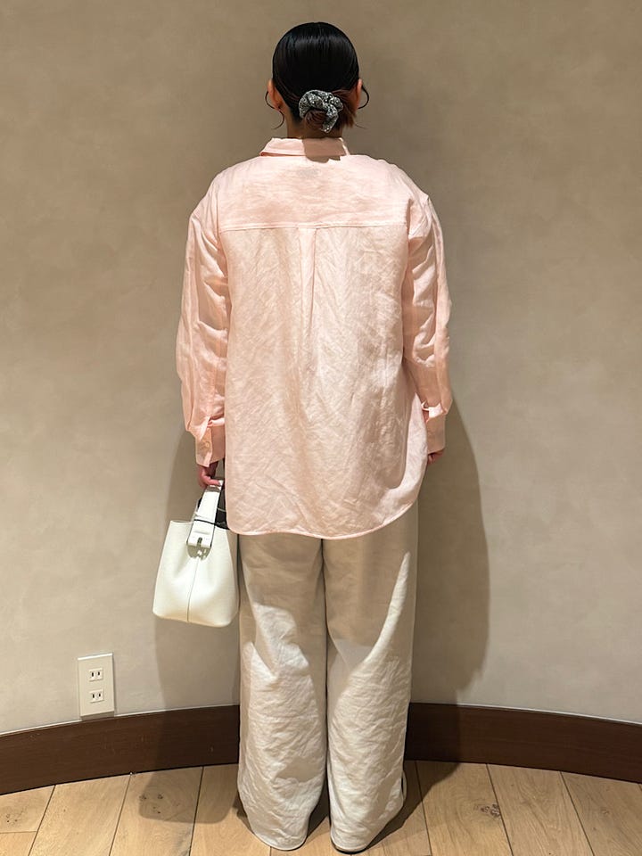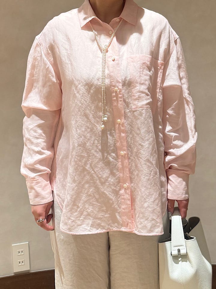【着心地】程よいピンクと、やや透け感もあって春らしいシャツです。すごく軽くて前を開けて羽織りとしても着て頂けます。