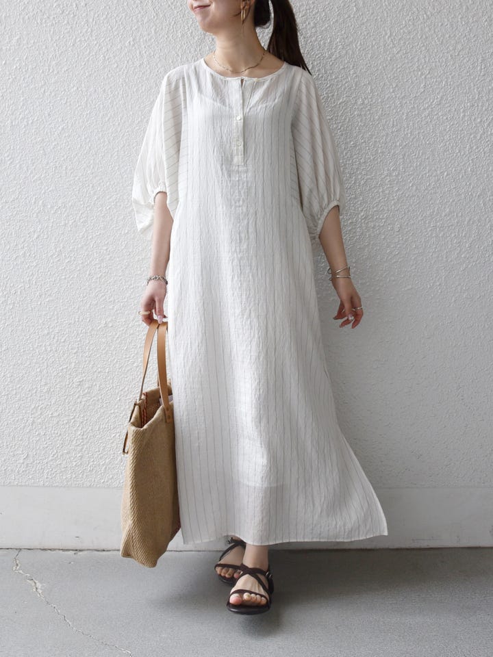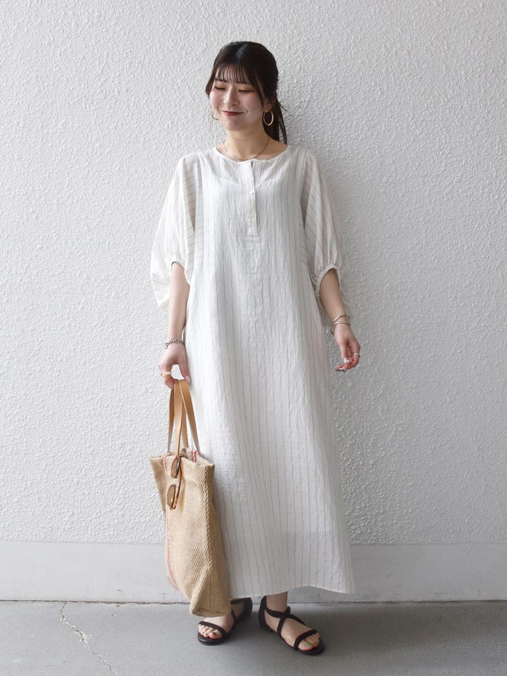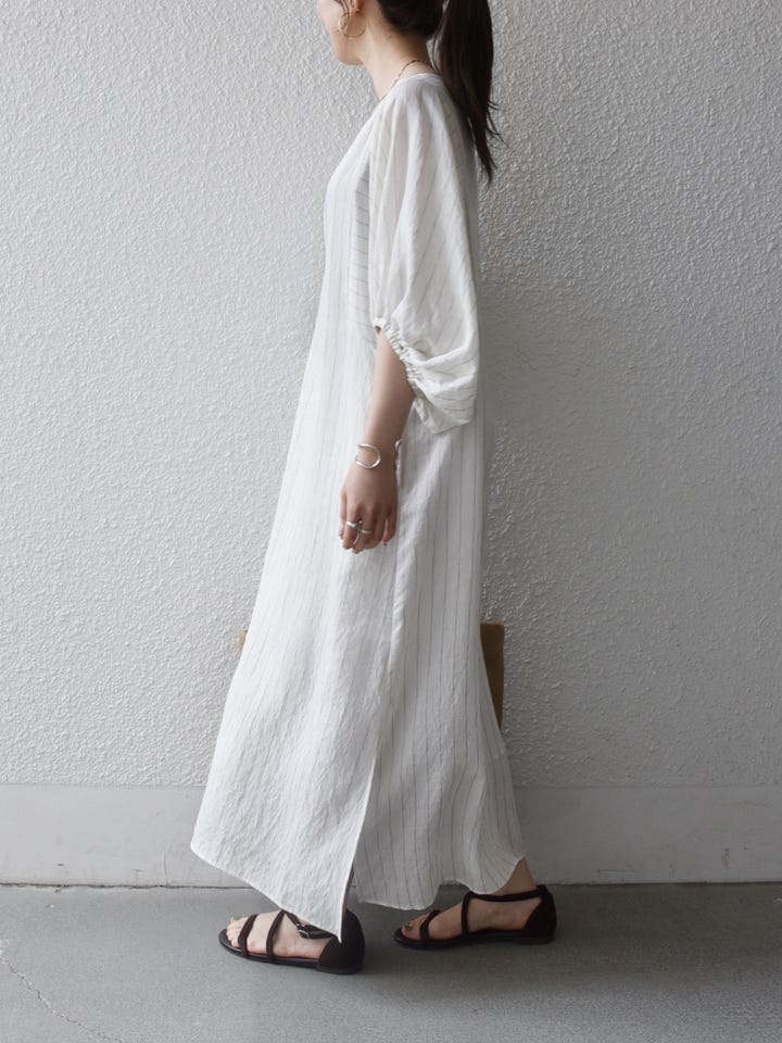 着用アイテム:SHIPS any:〈洗濯機可能〉リネン ミックス ボリュームスリーブ ストライプ ワンピース