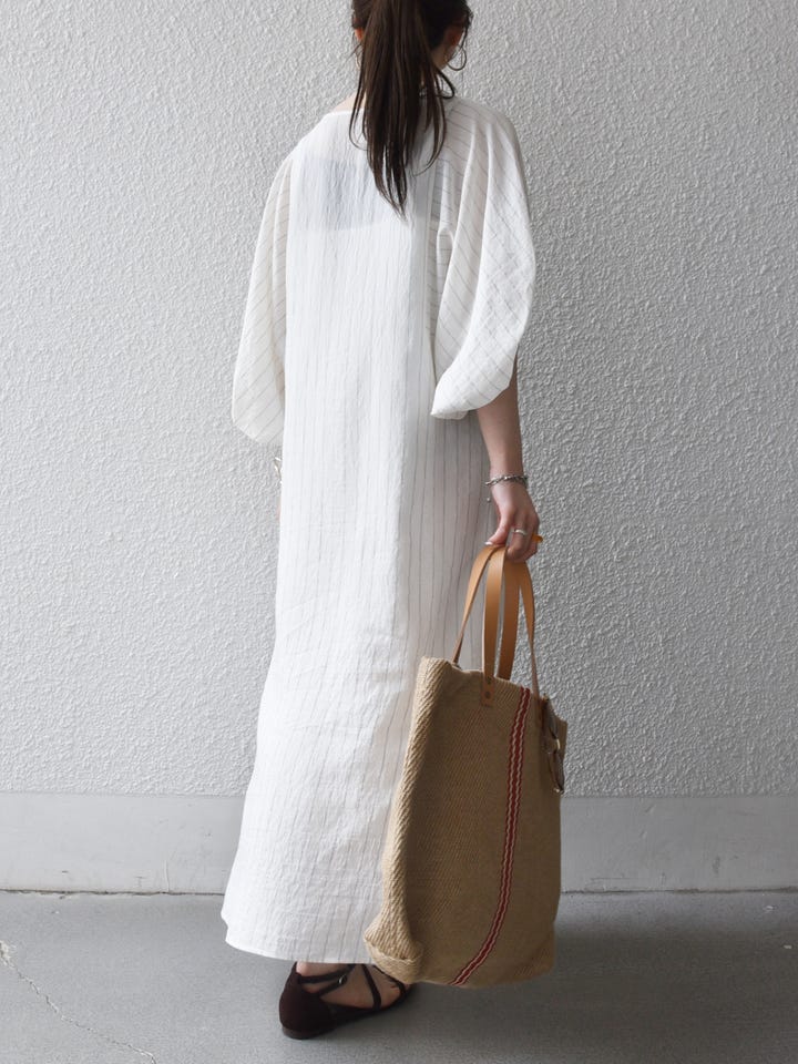 シアーワンピに麻バッグで柔らかいラフなスタイルに。