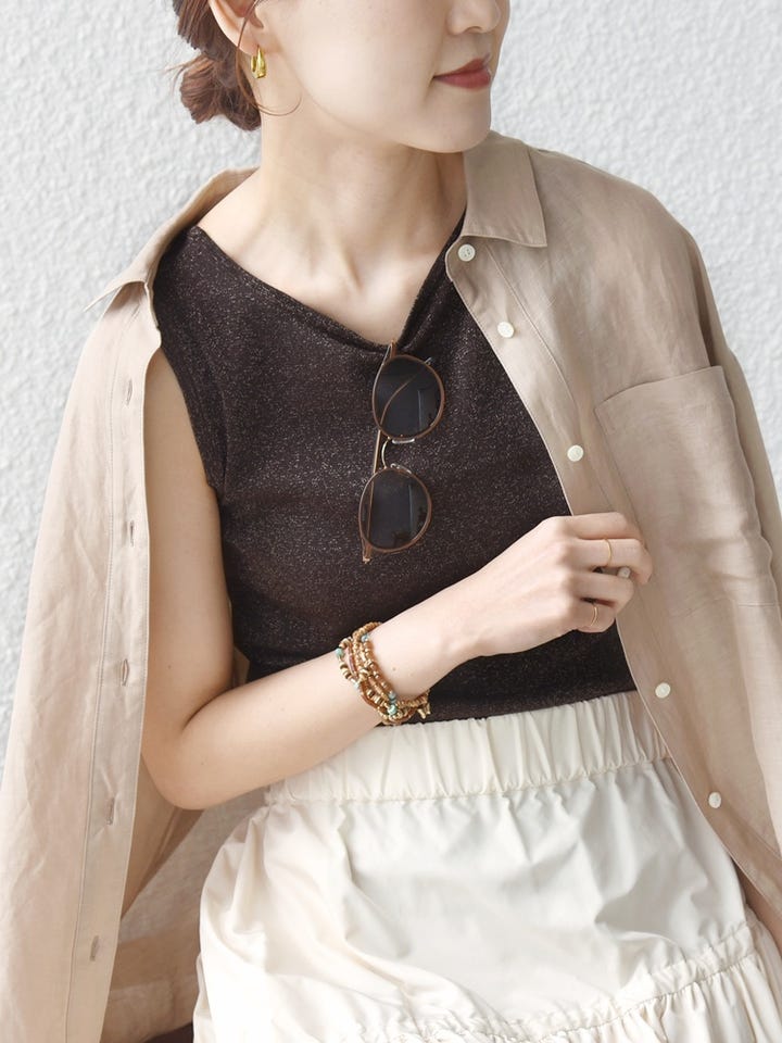 ■着心地:ラメのザラザラ感もなく、着心地が良いです。前後2WAY仕様でインナーとしても1枚でも活躍します。