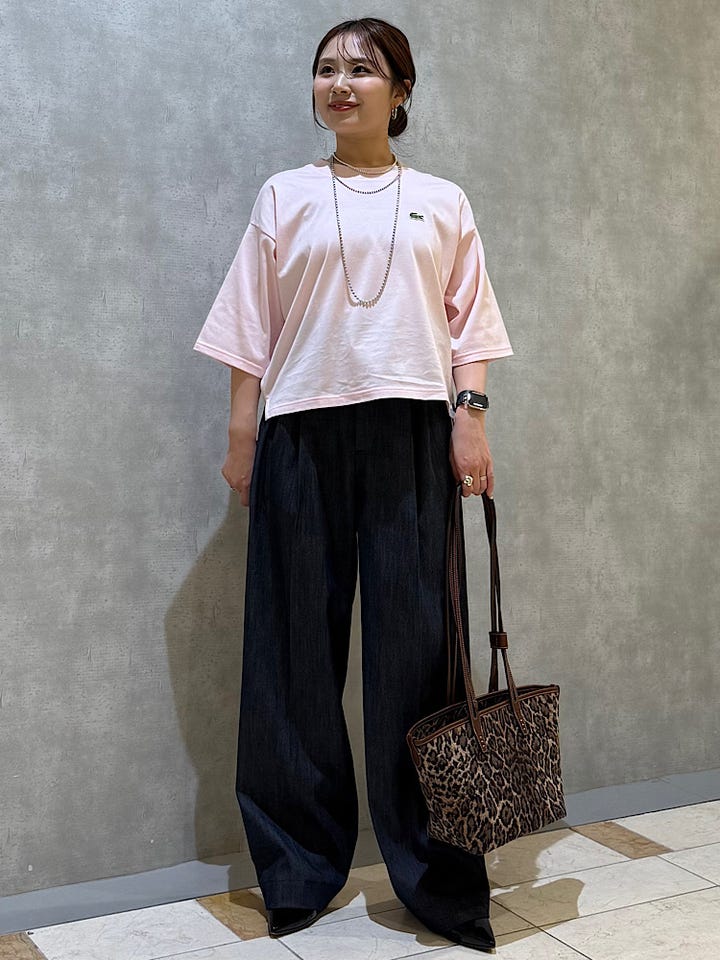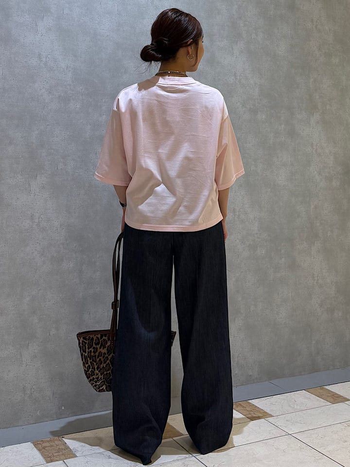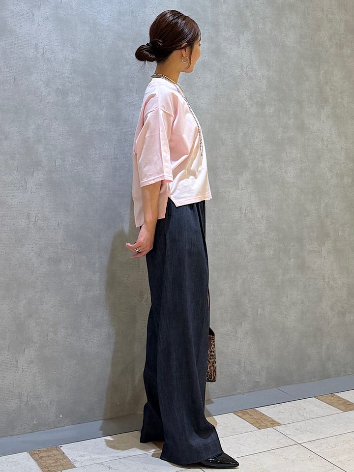 着用感:デニムライクな素材感ですが、光沢があるため綺麗見えします。タックのあるシルエットなので特に腰回りがカバーされます。