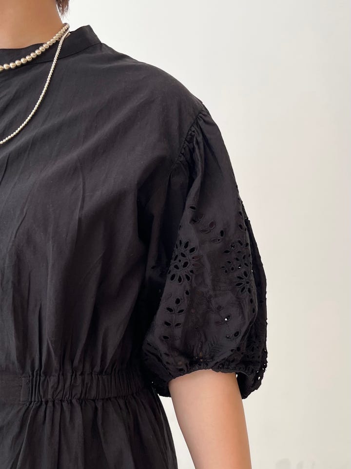 着心地:やや張りのある生地で立体感のあるシルエット。ウエストゴムが女性らしいシルエットを際立たせてくれます。袖のボリュームがしっかりあり、1枚でもとても華やかです。