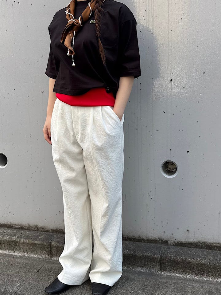 着心地 :別注でバック型にしているためお腹周りのシルエットが気にならない。程よい短丈でボトムが合わせやすい。