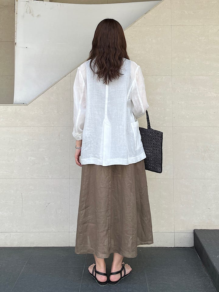 着心地:サラッとしていて軽く、これからの暑い季節にも日差し・冷房避けとして重宝するかと思います。シャツのような透け感があるので、あえて柄物のインナーを合わせても◎