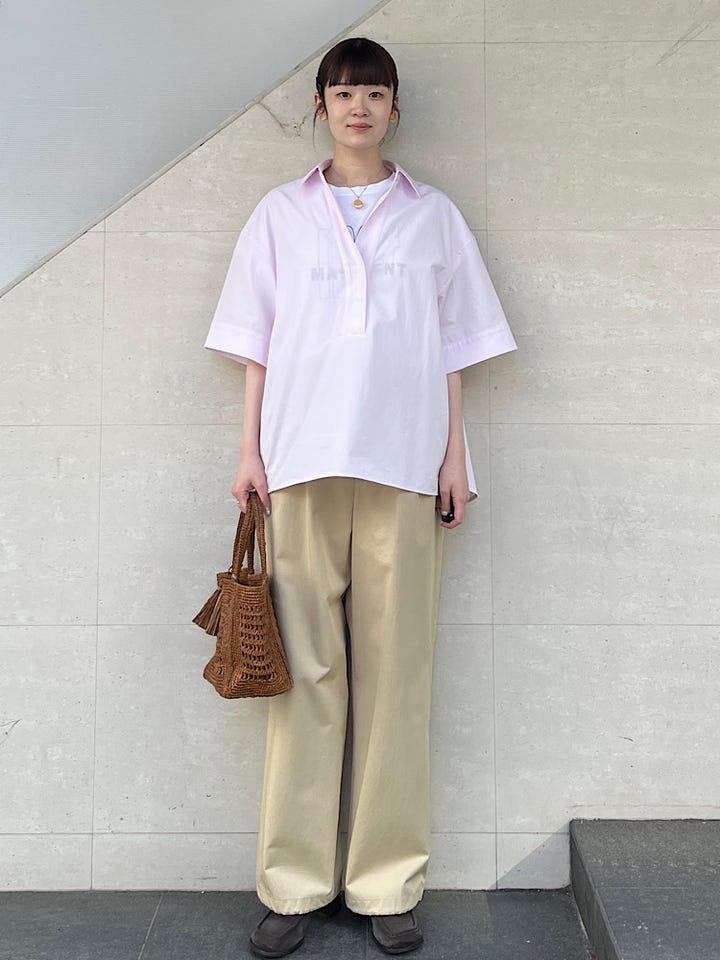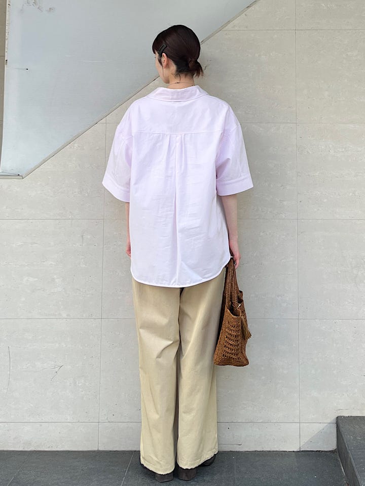 着心地:薄手のチノパンのような素材感ですが、広がりの程良いシルエットで上品な印象になります。ウエストもゴムなのでストレスフリーです。