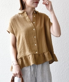 着用アイテム:カラミ フレンチ スリーブ ペプラム シャツ ブラウス キャメル