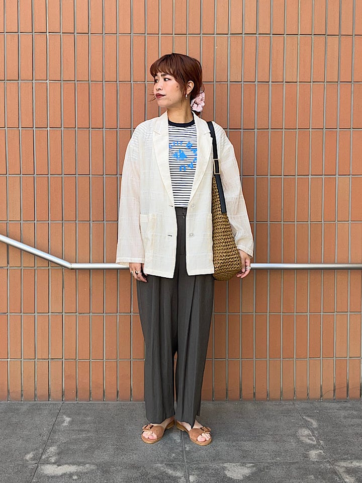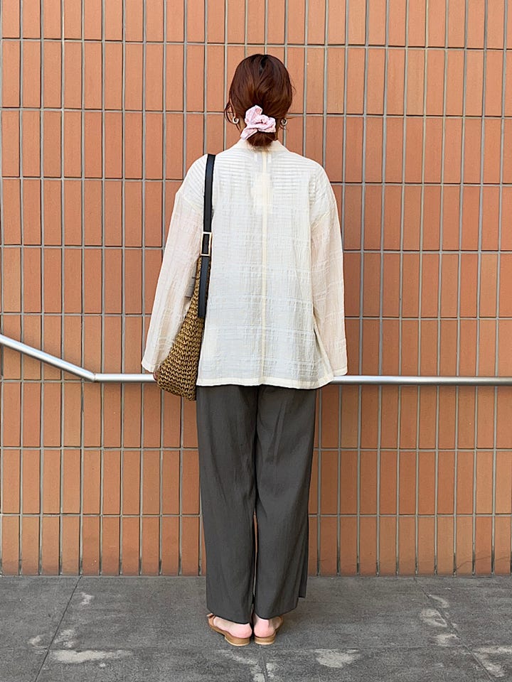 素材感・着心地:シアージャケットなので軽い着心地で夏場でも羽織として着用していただきやすいです。