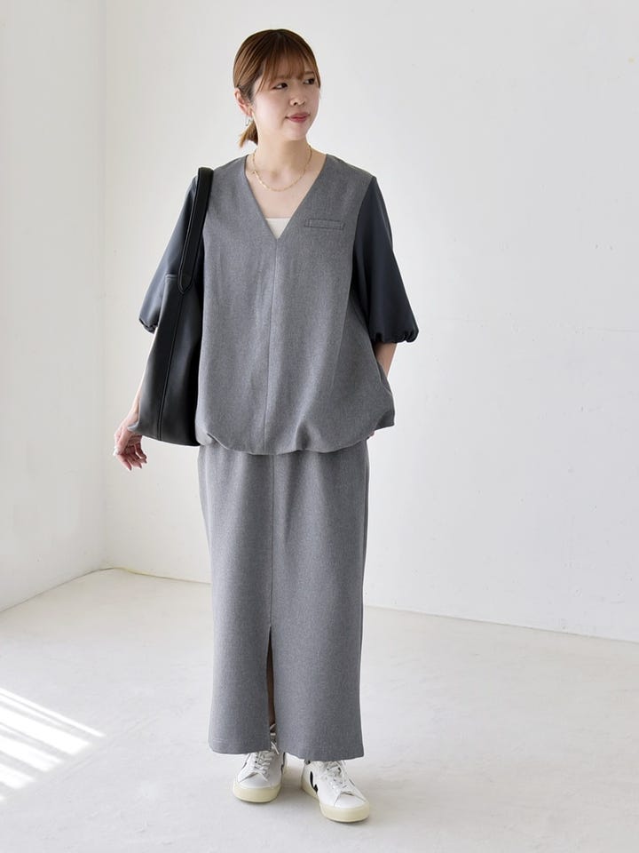 グレーのワントーンでまとめた、人気のセットアップスタイル。