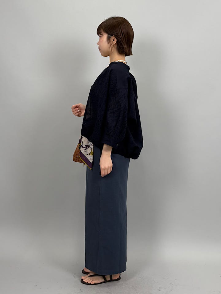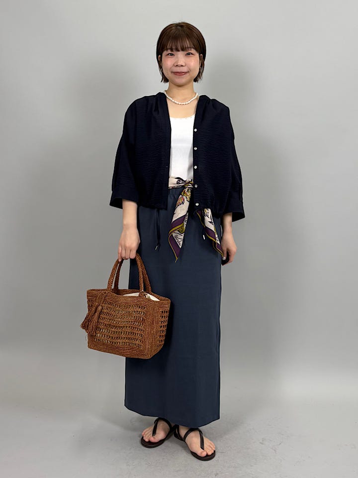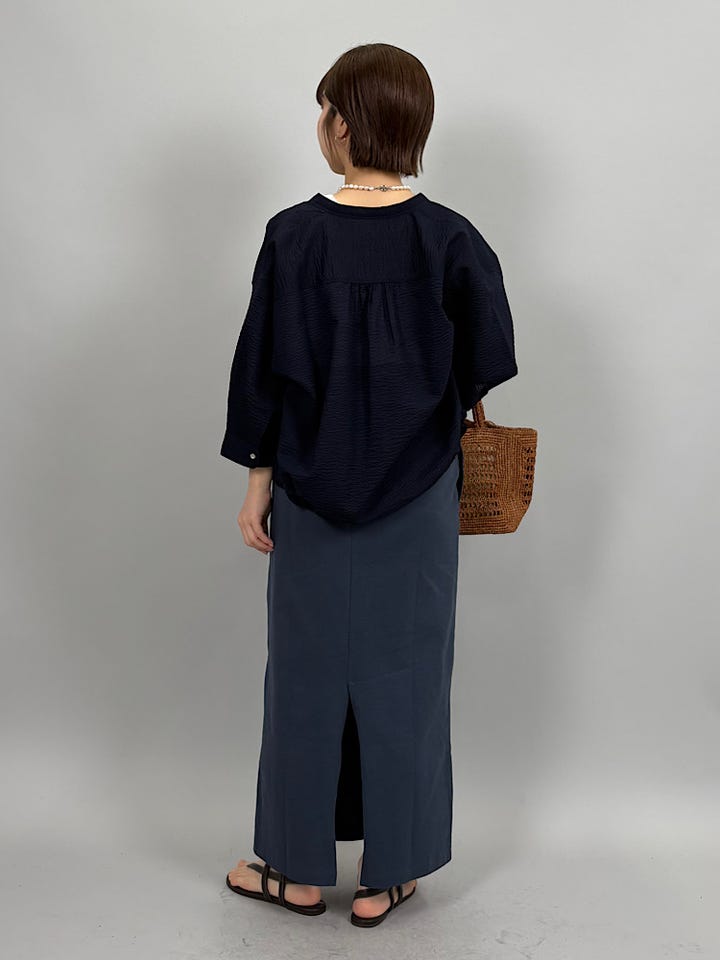 軽く凹凸のある綿素材。さらっとした肌触りで快適な着心地です◎1枚でもボタンを開けて羽織りでも使っていただけます。裾を絞るとシルエットを変えることができます。