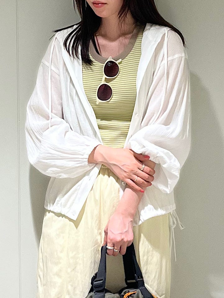 楊柳素材を使用していてガーゼのようにふんわりとした質感のブラウスになっています。やわらかい風合いなので敏感肌の方にも着用して頂きやすいです。ヒップラインまでしっかり隠れるのも嬉しいポイントです!両サイドの紐で裾調整できるのでスタイリングに合わせて変えられます。