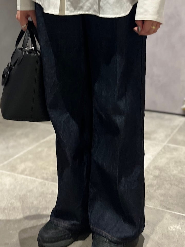 素材感/着心地:デニムパンツですがタックが入っているので脚が綺麗に見えます。