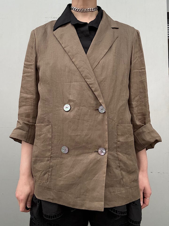 着心地:軽く肌離れのよい着心地です。素材の上品な光沢と、シェルボタンを採用しているデザインが大人な雰囲気で上質さを感じます。様々なスタイルでお楽しみ頂ける所もジャケットの良いところです。