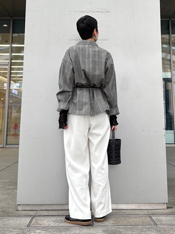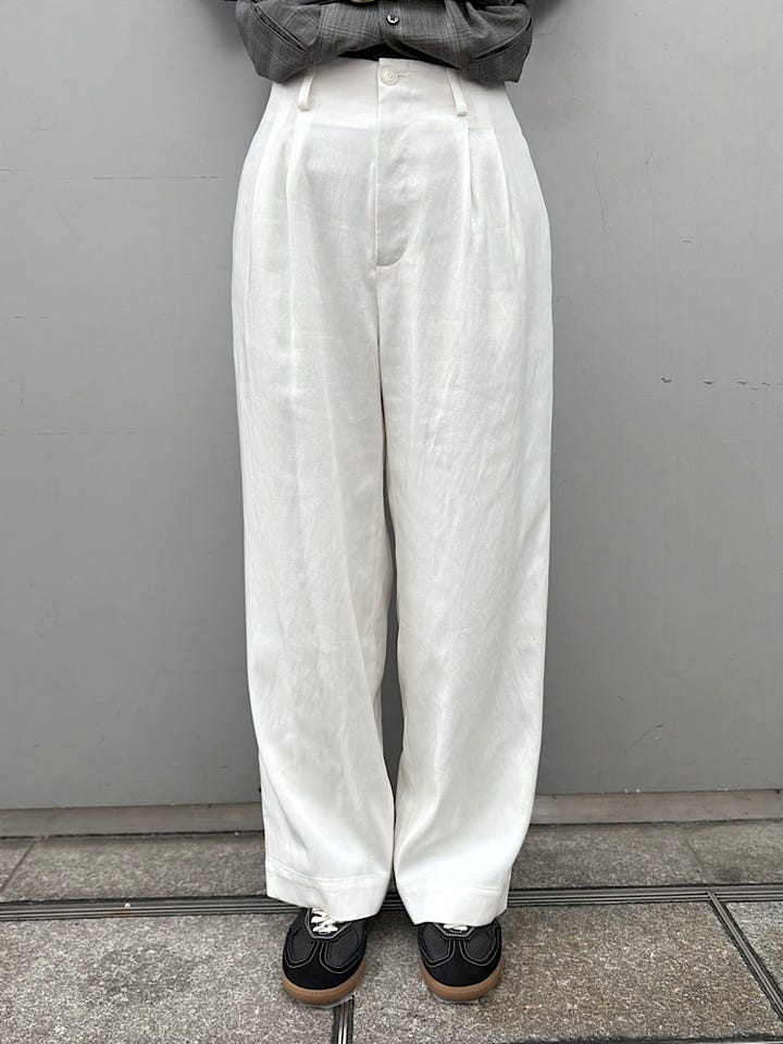 着心地:ワイドレングスでタック入りなので、ハンサムな印象のボトムになります。生地は柔らかく足捌きの良いボトムになります。ホワイトは裏地も付いているので安心して着用いただけます!