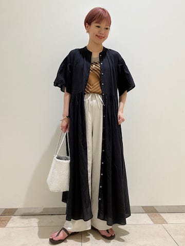 かなり軽めのサラッとした素材で気温の高い季節でも涼しく着れます。着丈も膝が隠れるぐらいあるので、露出も気にならずチャレンジしやすいです。