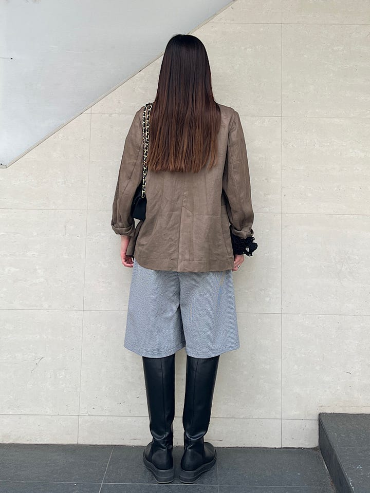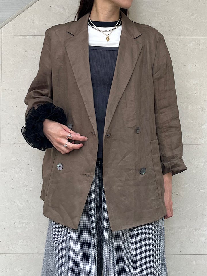 リネンのとても軽い素材で、これから先気温の高い季節もサラッと羽織やすいです。ゆったりしたシルエットでカジュアルにも使いやすいです。