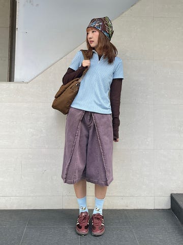 サイズ感:全体的にゆっくりしたサイズ感、すねが見える長さ。