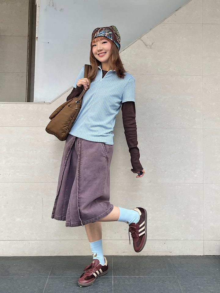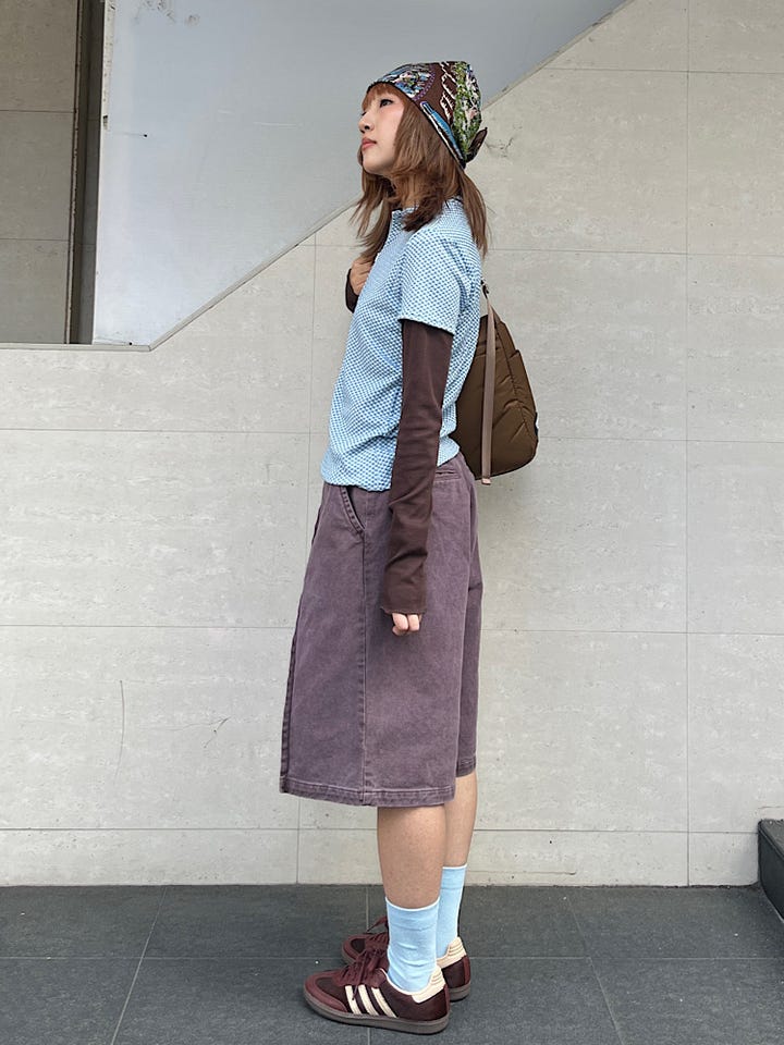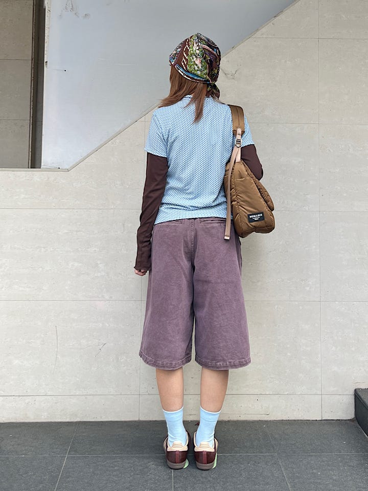 着心地:タックのデザインが珍しいです。前から見ても後ろから見ても可愛いデザインです。紫があったブラウンが水色と相性が良いです。