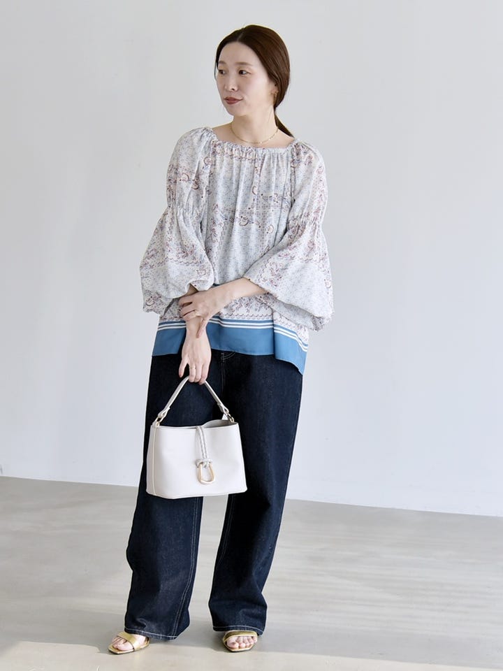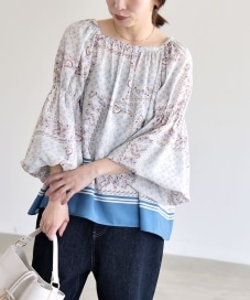 〔ONE SIZE〕quaranciel:〈洗濯機可能〉フラワー スカーフ プリント ギャザー パフ ブラウス