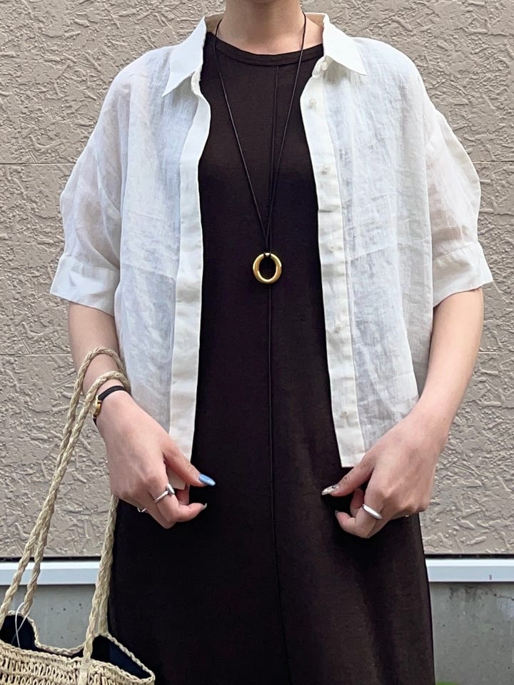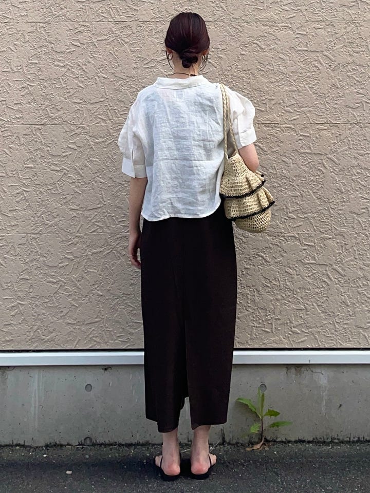 袖部分はパフスリーブで、とても柔らかいリネン素材。丈は少し短めで、ゆったりめのサイズ感。
