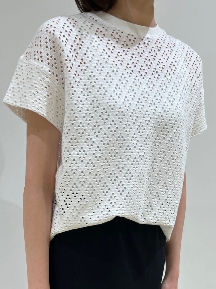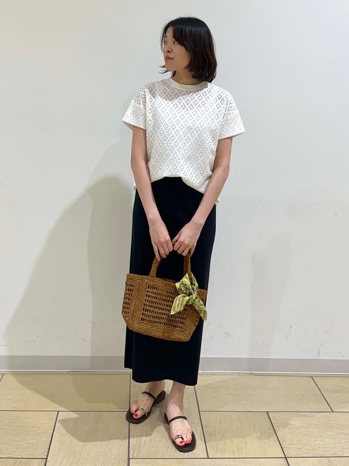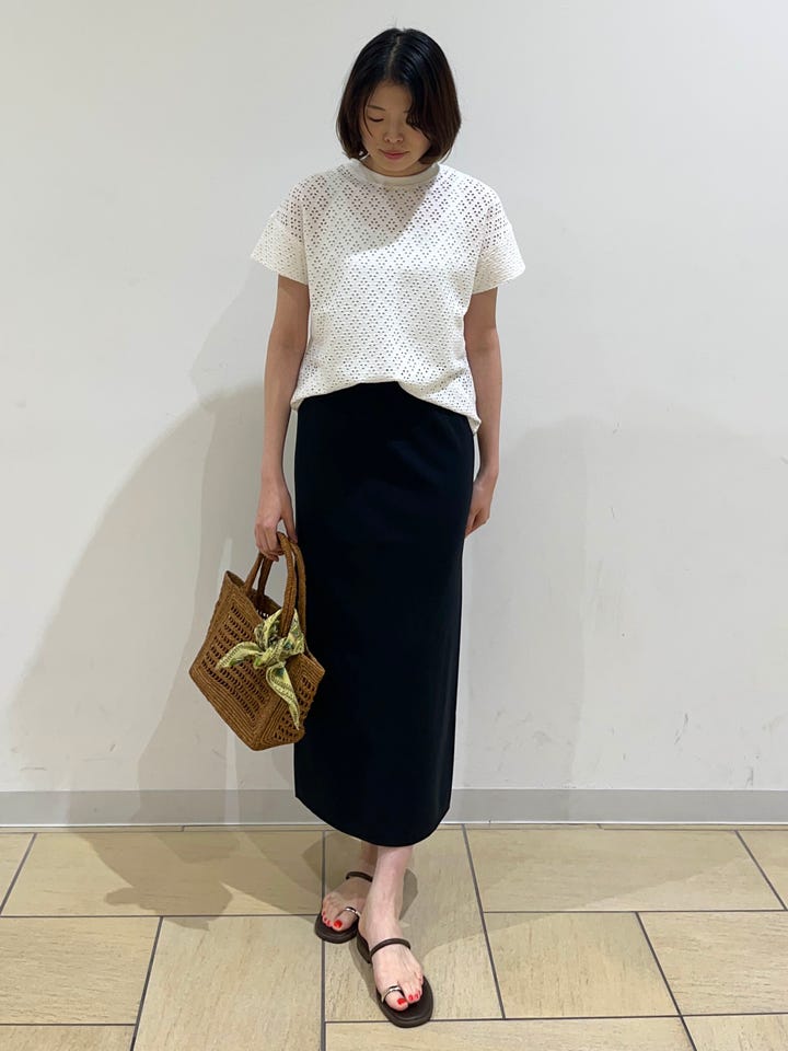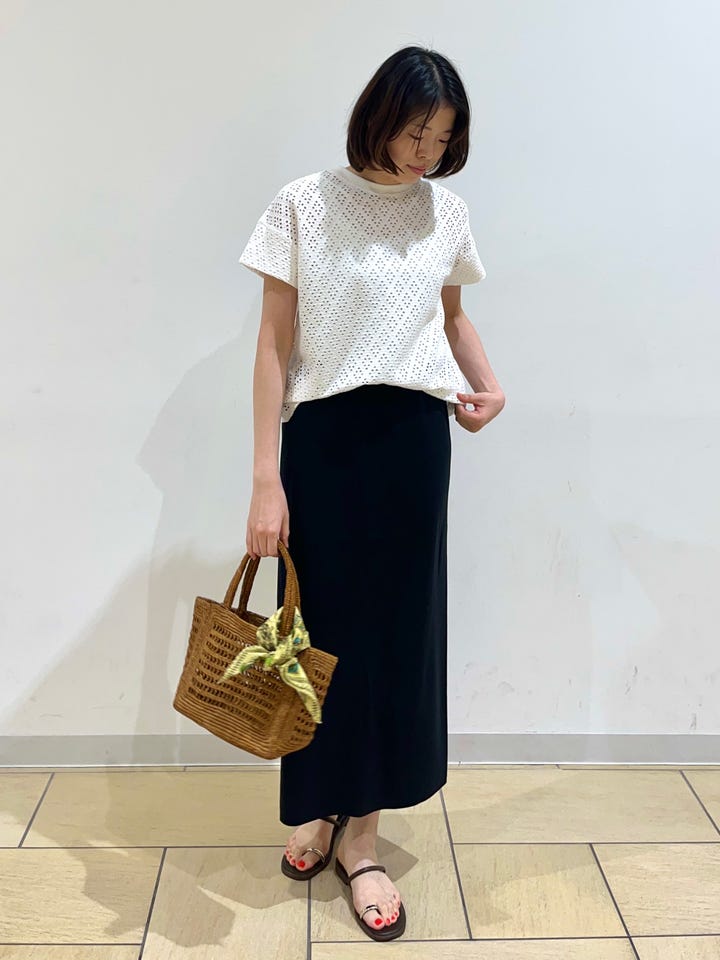 こなれ感のあるレース風カットソーにリブスカートを合わせれば、シワを気にせずコンパクトに持ち運べるので旅行の中日にぴったりな優秀コーデ。