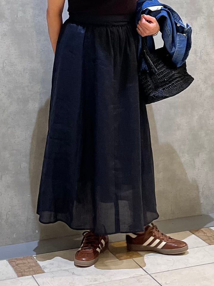 着用感 : ウエストはゴム仕様なのでゆとりあります。ヒップも拾わず広がり過ぎないシルエットとなっていて、リネン素材特有の透け感も涼しげで◎です。