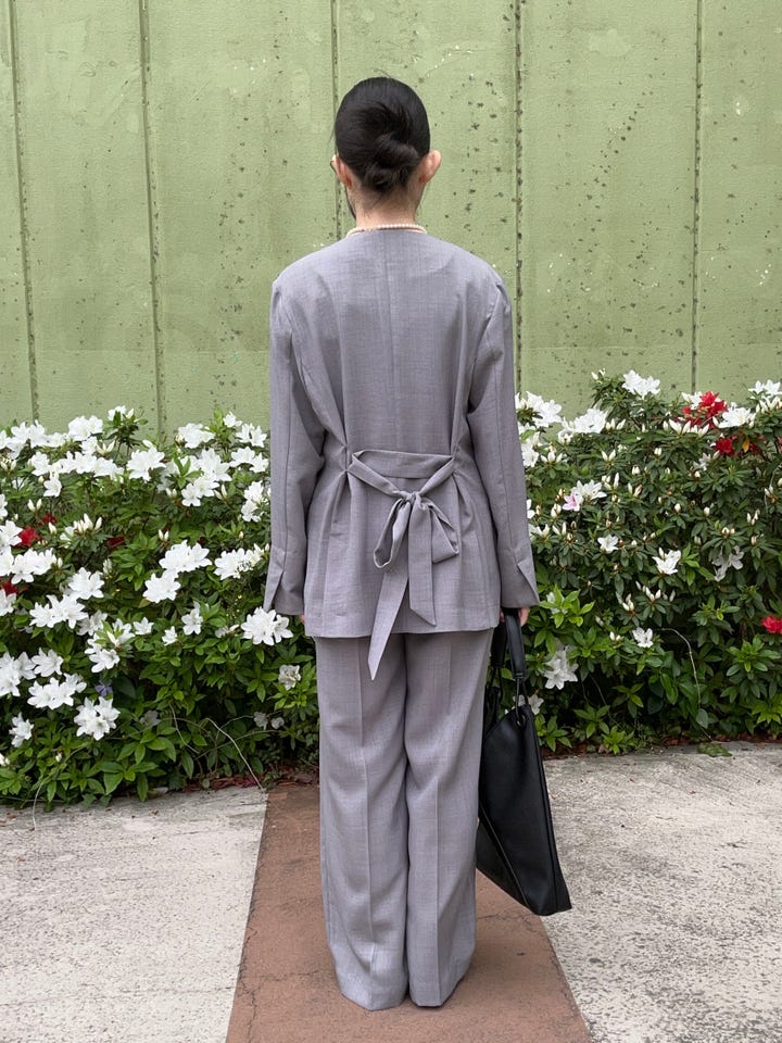 ノーカラーで首周りスッキリとした印象です!ウエストのリボンでシルエット調整ができます。